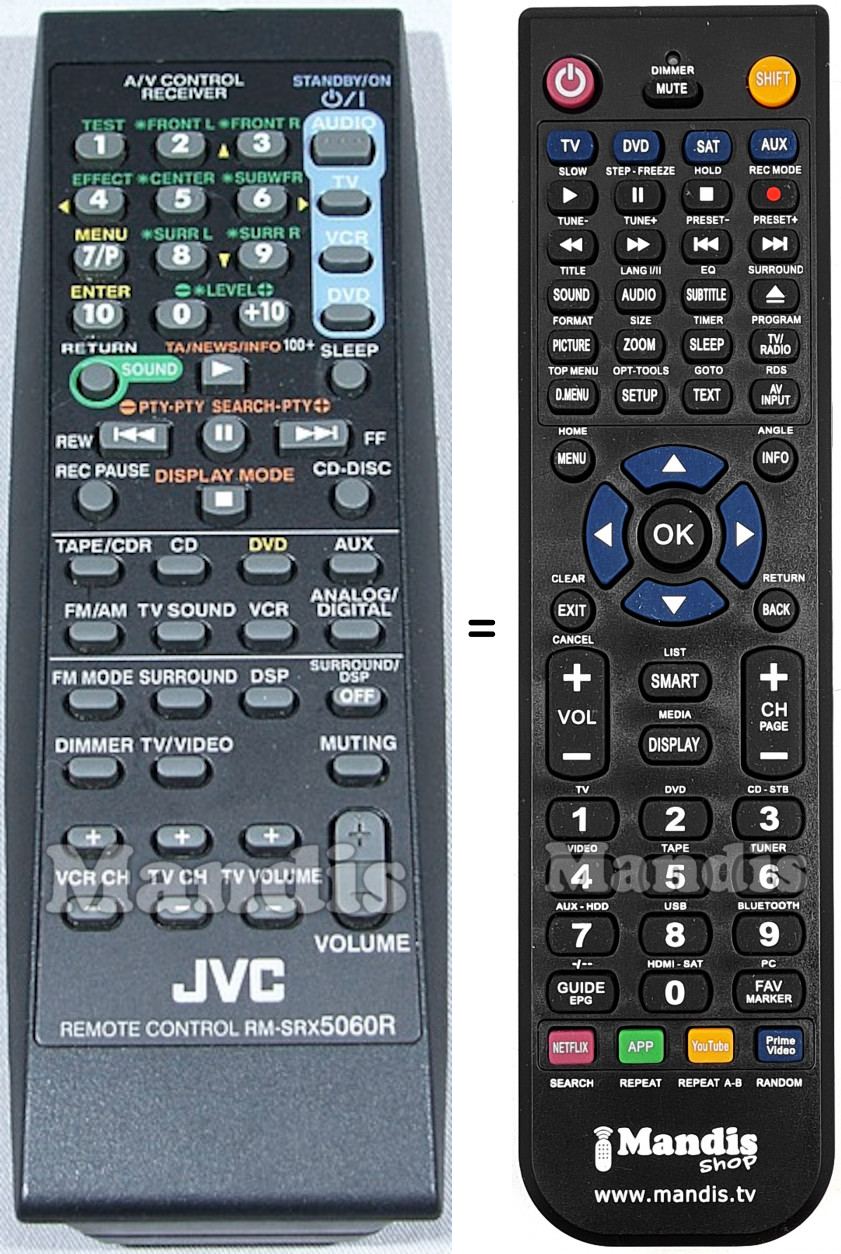Below, we will show you the correspondence between each button on the original remote control and the button that performs the same function on the replacement remote control. In some cases, you may need to press the SHIFT key before pressing another button to perform certain actions. These additional functions are often not widely used and are included to facilitate understanding of the replacement remote control, or because the original remote control has more buttons than its equivalent.