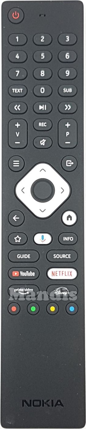 Power, 1, 2, 3, 4, 5, 6, 7, 8, 9, 0, Text, Sub, >>, Play/Pause, <<, V+, V-, P+, P-, Rec, Mute, =, [→], Home, ←, Up, Down, Right, Left, OK, *, Voice, Info, Guide, Source, YouTube, Netflix, prime video, Disney+, Red, Green, Yellow, Blue