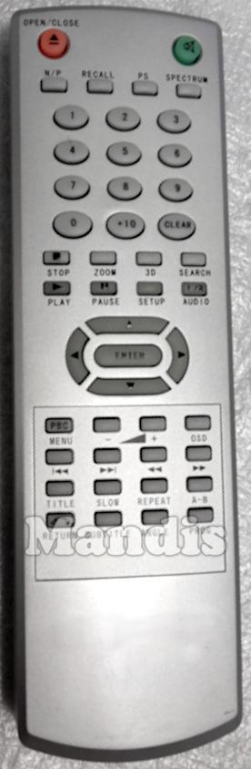 Open / Close, Mute, N/P, Recall, PS, Spectrum, 1, 2, 3, 4, 5, 6, 7, 8, 9, 0, +10, Clear, Stop, Zoom, 3D, Search, Play, Pause, Setup, Audio, Up, Left, Enter, Right, Down, PBC Menu, Vol-, Vol+, OSD, I<<, >>I, <<, >>, Title, Slow, Repeat, A-B, Return, Subtitle, Angle, Prog