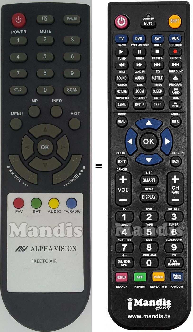 Below, we will show you the correspondence between each button on the original remote control and the button that performs the same function on the replacement remote control. In some cases, you may need to press the SHIFT key before pressing another button to perform certain actions. These additional functions are often not widely used and are included to facilitate understanding of the replacement remote control, or because the original remote control has more buttons than its equivalent.