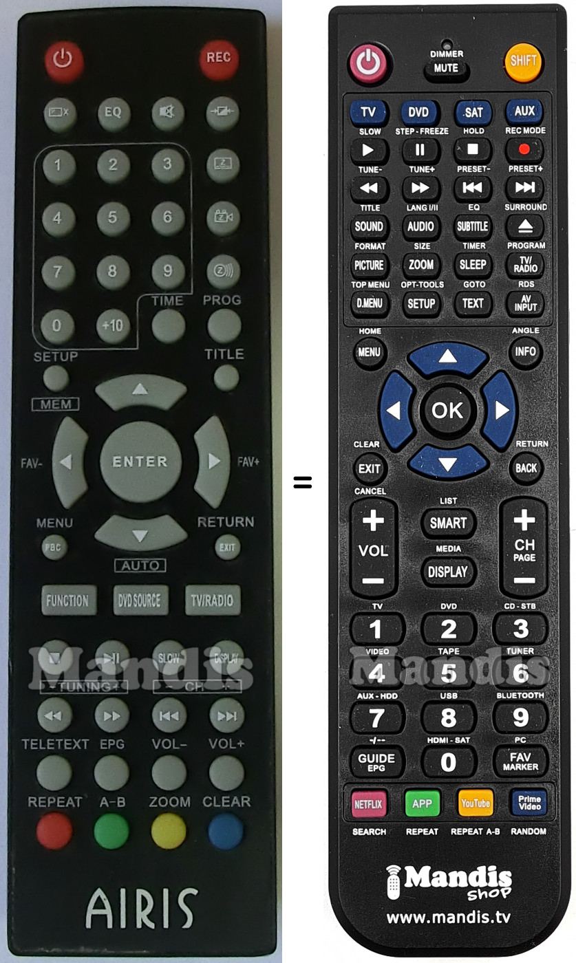 Below, we will show you the correspondence between each button on the original remote control and the button that performs the same function on the replacement remote control. In some cases, you may need to press the SHIFT key before pressing another button to perform certain actions. These additional functions are often not widely used and are included to facilitate understanding of the replacement remote control, or because the original remote control has more buttons than its equivalent.