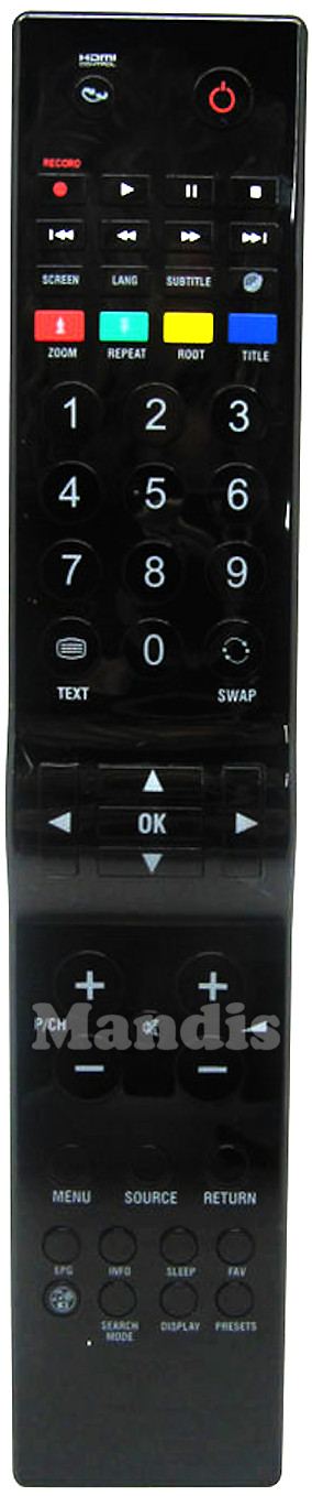 Power, HDMI Control, Rec, PLay, Pause, Stop, I<<, <<, >>, >>I, Screen, Lang, Subtitle, PIP / World, Red / Zoom, Green / Repeat, Yellow / Root, Blue / Title, 1, 2, 3, 4, 5, 6, 7, 8, 9, 0, Text, Swap, Up, Right, Down, Left, OK, P/CH +, P / CH -, Mute, Vol +, Vol -, Menu, Source, Return, EPG, Info, Sleep, Fav, Angle / Media, Search Mode, Display, Presets
