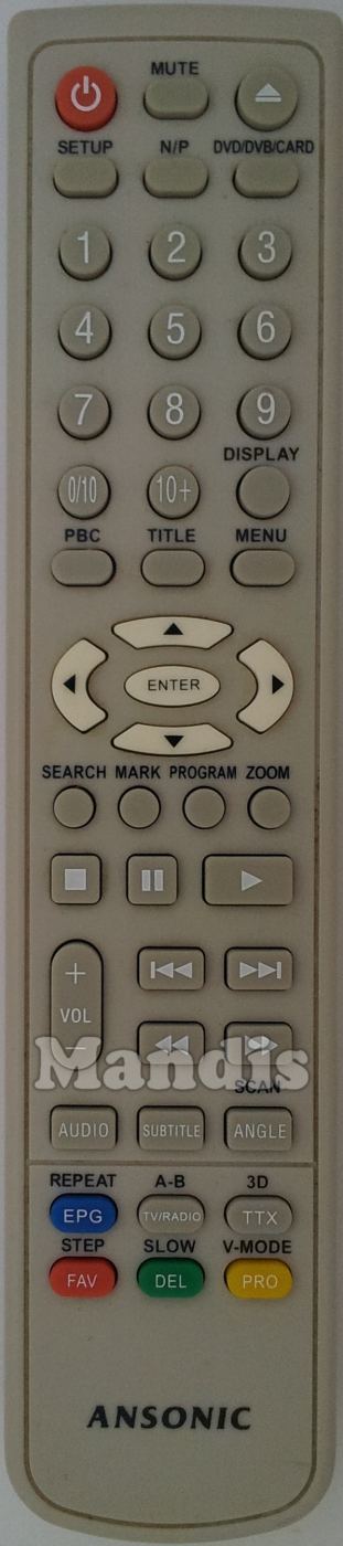 Power, Mute, Open/Close, Setup, N/P, DVD/DVB/Card, 1, 2, 3, 4, 5, 6, 7, 8, 9, 10+, 0/10, Display, PBC, Title, Menu, Up, Down, Right, Left, Enter, Search, Mark, Program, Zoom, Play, Pause, Stop, Vol+, Vol-, I<<, >>I, <<, >>, Angle/Scan, Subtitle, Audio, Blue/EPG/Repeat, Tv/Radio/A-B, TTX/3D, Red/FAV/Step, Green/Del/Slow, Yellow/Pro/V-Mode