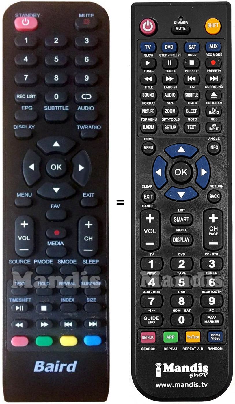 Below, we will show you the correspondence between each button on the original remote control and the button that performs the same function on the replacement remote control. In some cases, you may need to press the SHIFT key before pressing another button to perform certain actions. These additional functions are often not widely used and are included to facilitate understanding of the replacement remote control, or because the original remote control has more buttons than its equivalent.