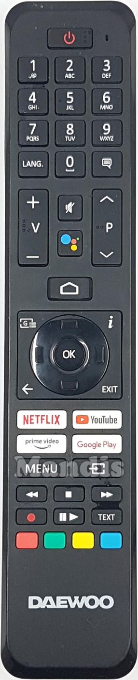 Power, 1, 2, 3, 4, 5, 6, 7, 8, 9, 0, Lang, [=].., Vol+, Vol-, Mute, Smart, P+, P-, Home, [G], i, ←, Exit, Up, Down, Left, Right, OK, Netflix, YouTube, prime video, Google Play, Menu, Source, <<, Stop, >>, Rec, Pause/Play, Text, Red, Green, Yellow, Blue