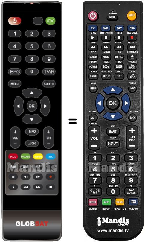 Below, we will show you the correspondence between each button on the original remote control and the button that performs the same function on the replacement remote control. In some cases, you may need to press the SHIFT key before pressing another button to perform certain actions. These additional functions are often not widely used and are included to facilitate understanding of the replacement remote control, or because the original remote control has more buttons than its equivalent.