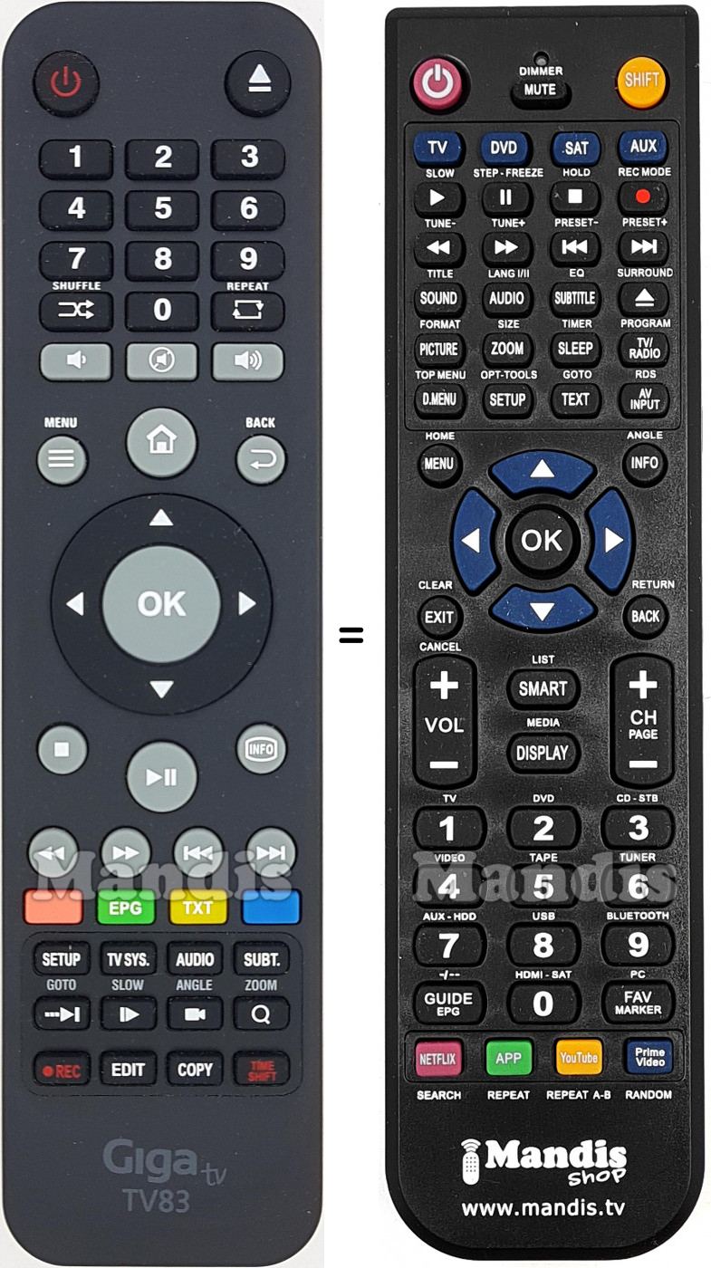Below, we will show you the correspondence between each button on the original remote control and the button that performs the same function on the replacement remote control. In some cases, you may need to press the SHIFT key before pressing another button to perform certain actions. These additional functions are often not widely used and are included to facilitate understanding of the replacement remote control, or because the original remote control has more buttons than its equivalent.