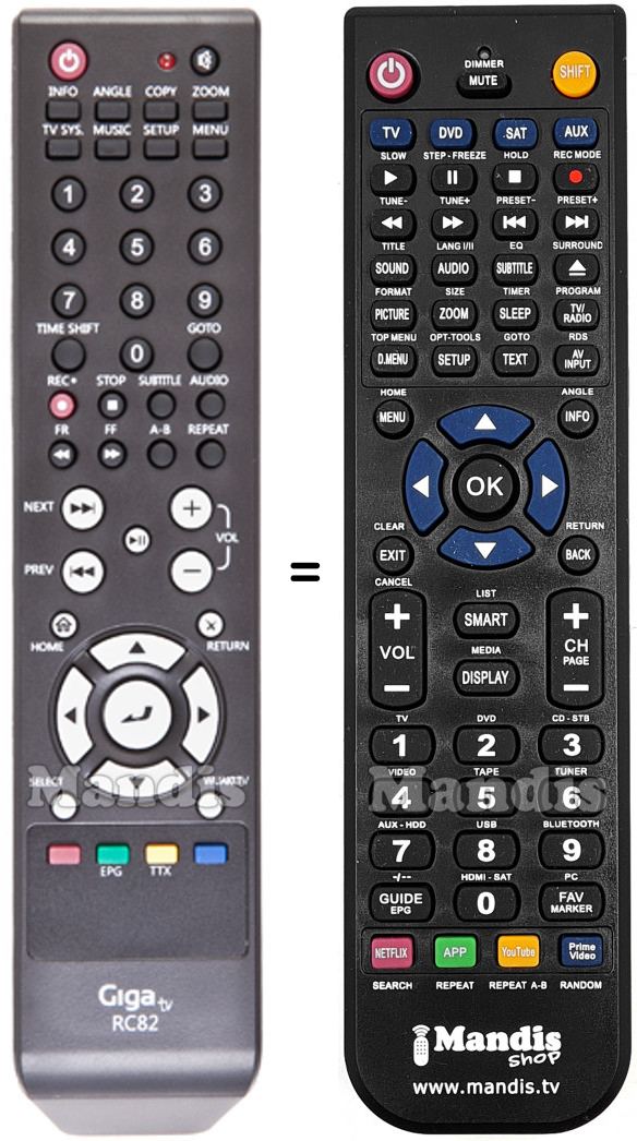 Below, we will show you the correspondence between each button on the original remote control and the button that performs the same function on the replacement remote control. In some cases, you may need to press the SHIFT key before pressing another button to perform certain actions. These additional functions are often not widely used and are included to facilitate understanding of the replacement remote control, or because the original remote control has more buttons than its equivalent.