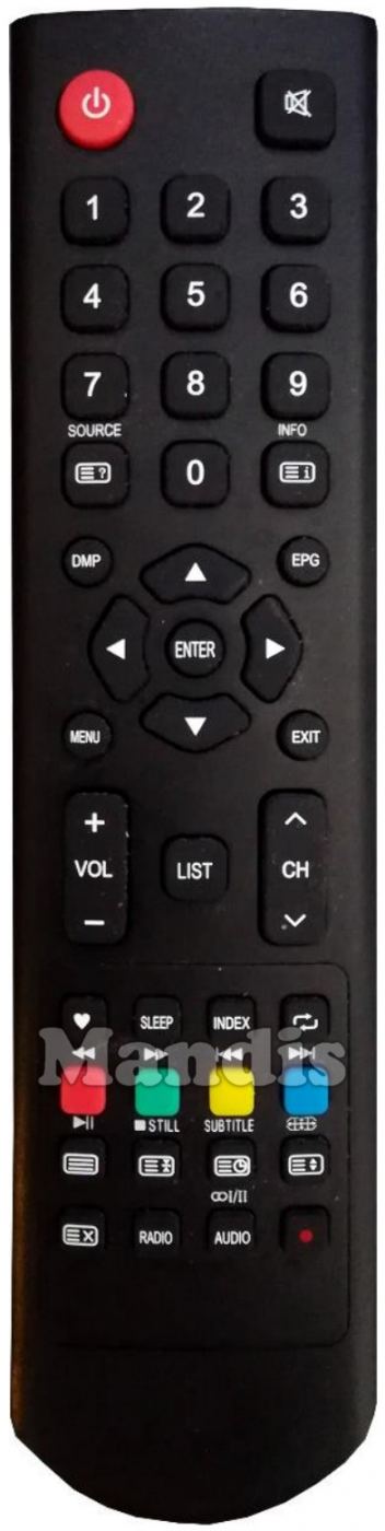 Power, Mute, 1, 2, 3, 4, 5, 6, 7, 8, 9, 0, Source, Info, DMP, EPG, Exit, Menu, Up, Right, Down, Left, Enter, Vol +, Vol -, List, CH +, CH -, Favorites, Sleep, Index, Recall, Red / <<, Green / >>, Yellow / I<<, Blue / >>I, Text / Play/Pause, Hold / Stop / Still, Timer / Subtitle, Size, [=x], Radio, Audio I/II, Rec