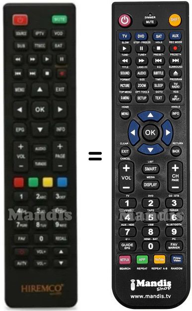 Below, we will show you the correspondence between each button on the original remote control and the button that performs the same function on the replacement remote control. In some cases, you may need to press the SHIFT key before pressing another button to perform certain actions. These additional functions are often not widely used and are included to facilitate understanding of the replacement remote control, or because the original remote control has more buttons than its equivalent.