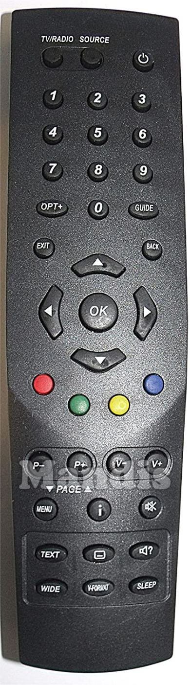 TV/Radio, Source, Power, 1, 2, 3, 4, 5, 6, 7, 8, 9, 0, OPT+, Guide, Exit, Back, Up, Down, Left, Right, OK, Red, Green, Yellow, Blue, Page -, Page +, V -, V +, Menu, i, Mute, Text, [_], Mute, Wide, V-Format, Sleep