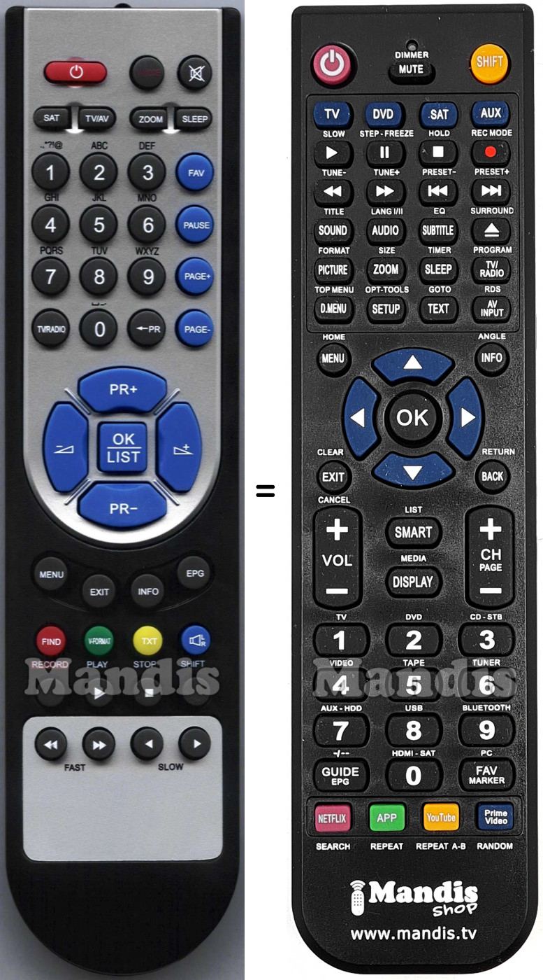 Below, we will show you the correspondence between each button on the original remote control and the button that performs the same function on the replacement remote control. In some cases, you may need to press the SHIFT key before pressing another button to perform certain actions. These additional functions are often not widely used and are included to facilitate understanding of the replacement remote control, or because the original remote control has more buttons than its equivalent.