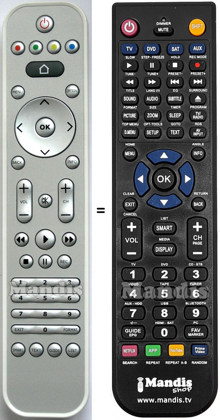Below, we will show you the correspondence between each button on the original remote control and the button that performs the same function on the replacement remote control. In some cases, you may need to press the SHIFT key before pressing another button to perform certain actions. These additional functions are often not widely used and are included to facilitate understanding of the replacement remote control, or because the original remote control has more buttons than its equivalent.