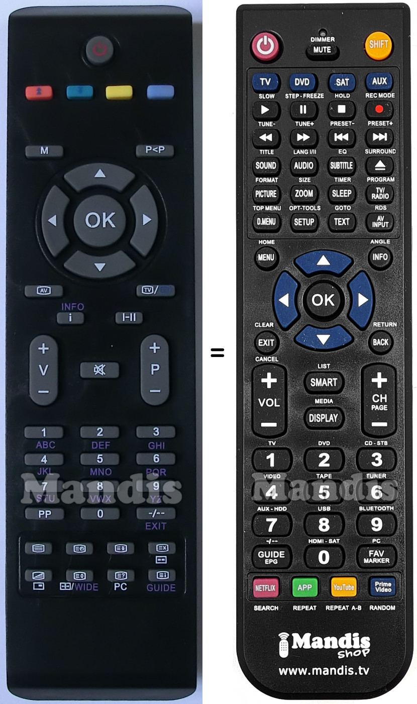 Below, we will show you the correspondence between each button on the original remote control and the button that performs the same function on the replacement remote control. In some cases, you may need to press the SHIFT key before pressing another button to perform certain actions. These additional functions are often not widely used and are included to facilitate understanding of the replacement remote control, or because the original remote control has more buttons than its equivalent.