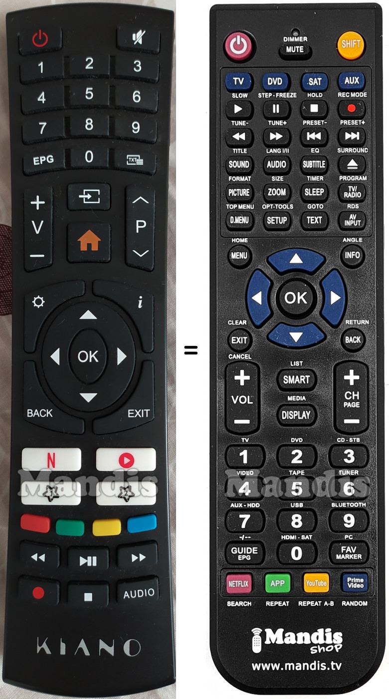 Below, we will show you the correspondence between each button on the original remote control and the button that performs the same function on the replacement remote control. In some cases, you may need to press the SHIFT key before pressing another button to perform certain actions. These additional functions are often not widely used and are included to facilitate understanding of the replacement remote control, or because the original remote control has more buttons than its equivalent.