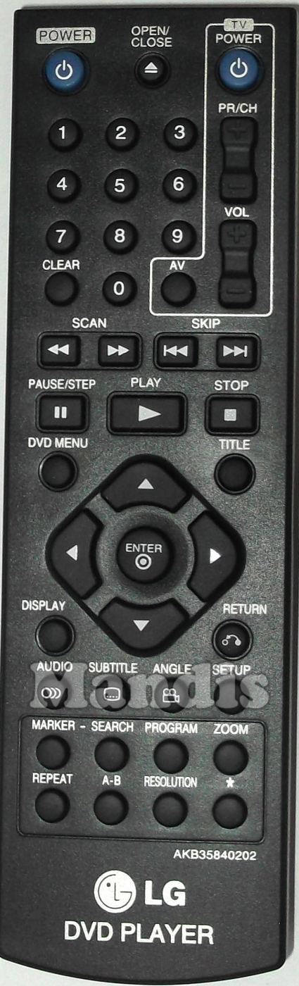 Power, Open / Close, 1, 2, 3, 4, 5, 6, 7, 8, 9, 0, Clear, Power TV, PR + / CH + TV, PR - / CH - TV, Vol + TV, Vol - TV, AV TV, << / Scan -, >> / Scan +, I<< / Skip -, >>I / Skip +, Pause / Step, Play, Stop, DVD Menu, Title, Up, Down, Right, Left, Enter, Display, Return, Audio, Subtitle, Angle, Setup, Marker, Search, Program, Zoom, Repeat, A-B, Resolution, *