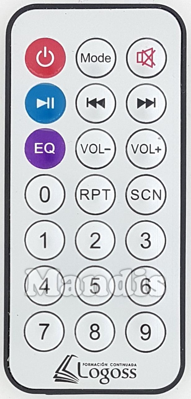 Power, Play/Pause, EQ, Mode, Mute, I<<, >>I, Vol-, Vol+, 0, RPT, SCN, 1, 2, 3, 4, 5, 6, 7, 8, 9