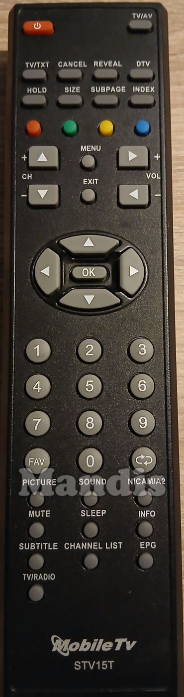 original remote control STV15T (ver 1) used for televisions for the brand MOBILE TV. This is an original remote control.
