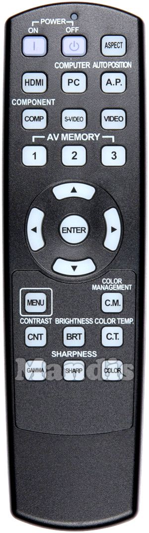 Power On, Power Off, Aspect, HDMI, PC / Computer, Auto Position, Component, S-Video, Video, AV Memory 1, AV Memory 2, AV Memory 3, Up, Left, Enter, Right, Down, Menu, Color Management, Contrast, Brightness, Color Temp., Gamma, Sharp, Color