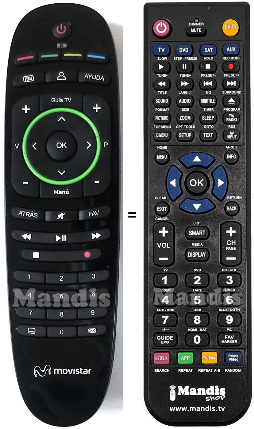 Below, we will show you the correspondence between each button on the original remote control and the button that performs the same function on the replacement remote control. In some cases, you may need to press the SHIFT key before pressing another button to perform certain actions. These additional functions are often not widely used and are included to facilitate understanding of the replacement remote control, or because the original remote control has more buttons than its equivalent.
