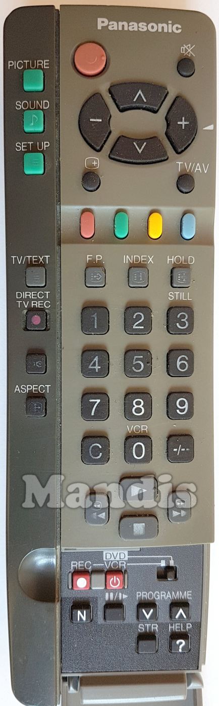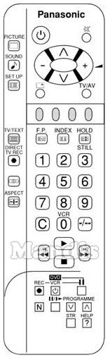 Power, Mute, Up / CH +, Down / CH -, Left / Vol -, Right / Vol +, Info, TV / AV, Picture, Sound, SET UP, Red, Green, Yellow, Blue, TV / Text, F.P., Index, Hold / Still, Direct TV Rec, , Aspect, 1, 2, 3, 4, 5, 6, 7, 8, 9, 0 / VCR, C, -/--, Power DVD / VCR, Rec, N, Pause / Step, Programe -, Programme +, STR, Help, Play, Stop, >>, <<