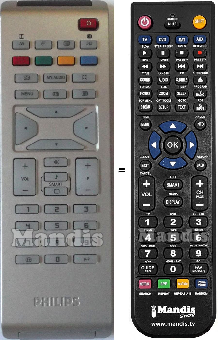 This remote control performs all the functions of the original remote control: Power, AV, Timer, , I-II, Red, Green, Yellow, Blue, , My Audio, , Menu, , , Up, Right, Down, Left, Vol +, Vol -, Mute, Audio, [ ], P +, P -*, 1, 2, 3, 4, 5, 6, 7, 8, 9, 0, i+, P < P