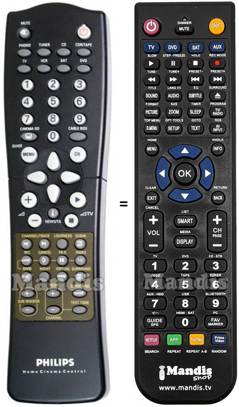 This remote control performs all the functions of the original remote control: Power, Mute, Phono, Tuner, CD, CDR / Tape, TV, VCR, SAT, DVD, 1, 2, 3, 4, 5, 6, 7, 8, 9, 0, Cinema Go, Cable Box, Menu / Guide, OK, Up, Right, Down, Left, Vol +, Vol -, i / News/TA, Play / TV Vol +, Stop / TV Vol -, I< / Channel/Track -, >I / Channel/Track +, Loudness, Subw. On/Off, Rec, Cancel, Pause / FR D., TC / Index, DVD Disc, Night, Virtual Mode, Surround On/Off, Sub Woofer +, Sub Woofer -, Rear Channel +, Rear Channel -, Surround Mode, Test Tone