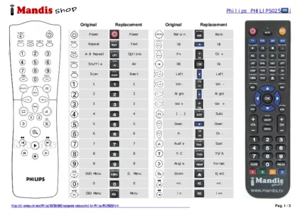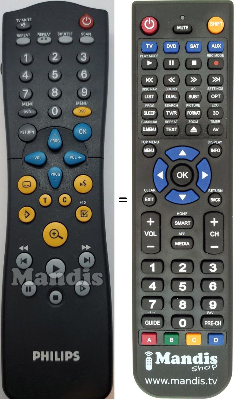 Below, we will show you the correspondence between each button on the original remote control and the button that performs the same function on the replacement remote control. In some cases, you may need to press the SHIFT key before pressing another button to perform certain actions. These additional functions are often not widely used and are included to facilitate understanding of the replacement remote control, or because the original remote control has more buttons than its equivalent.