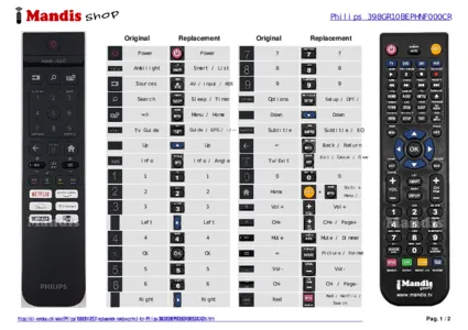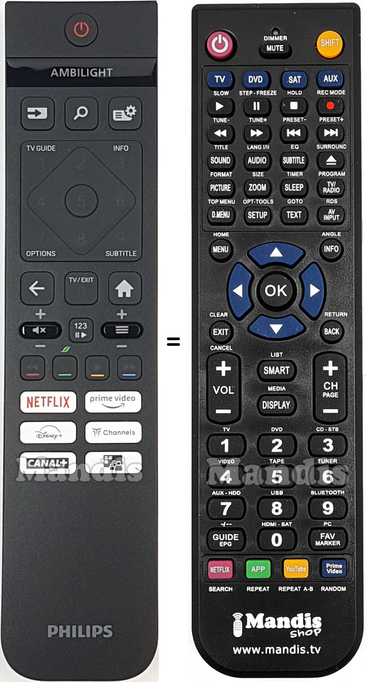 This remote control performs all the functions of the original remote control: Power, Ambilight, Sources, Search, =☼, Tv Guide, Info, 1, 2, 3, 4, 5, 6, 7, 8, 9, 0, Options, Subtitle, Tv/Exit, Left, Up, Down, Right, OK, ←, Home, 123/Pause/Play, Mute, =, Vol-, Vol+, CH+, CH-, <<, Pause, Play, >>, Red, Green, Yellow, Blue, Netflix, prime video, Disney+, Channels, Canal+, [*oo]