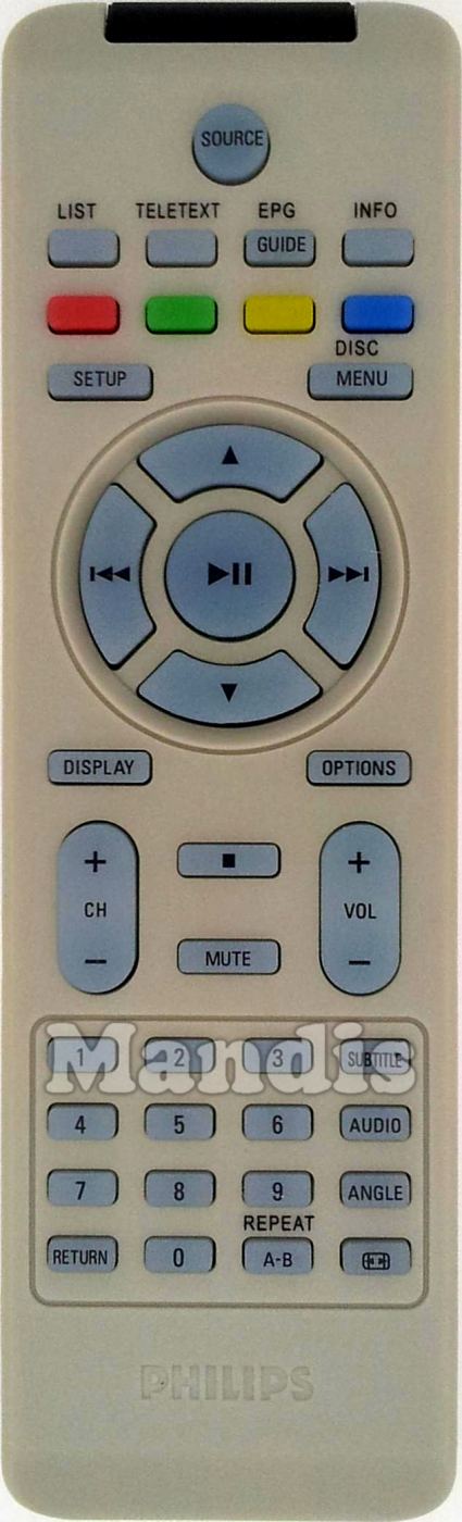 Source, List, Teletext, Guide / EPG, Info, Red, Green, Yellow, Blue, Setup, Disc Menu, Up, Down, Right / >>I, Left / I<<, Play / Pause, Display, Options, CH +, CH -, Stop, Vol +, Vol -, Mute, 1, 2, 3, 4, 5, 6, 7, 8, 9, 0, Return, Repeat A-B, Subtitle, Audio, Angle, Format