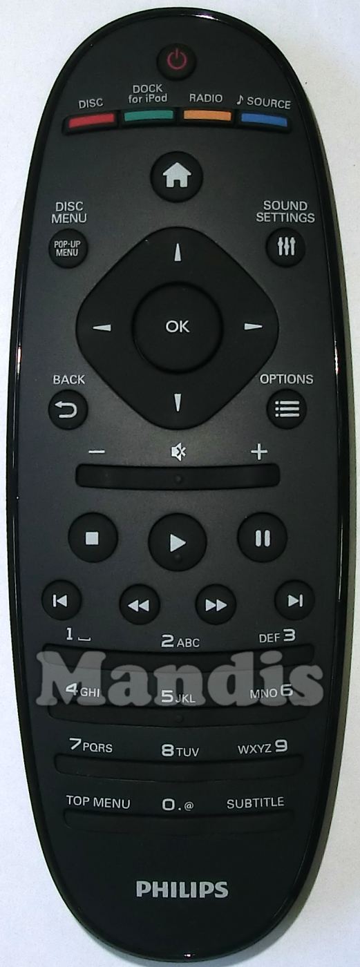 Power, Red / Disc, Green / DOCK for iPod, Yellow / Radio, Blue / Source, Home, Pop-Up Menu / Disc Menu, Sound Settings, Up, Right, Down, Left, OK, Back, Options, Vol -, Mute, Vol +, Stop, Play, Pause, I<, <<, >>, >I, 1, 2, 3, 4, 5, 6, 7, 8, 9, 0, Top Menu, Subtitle