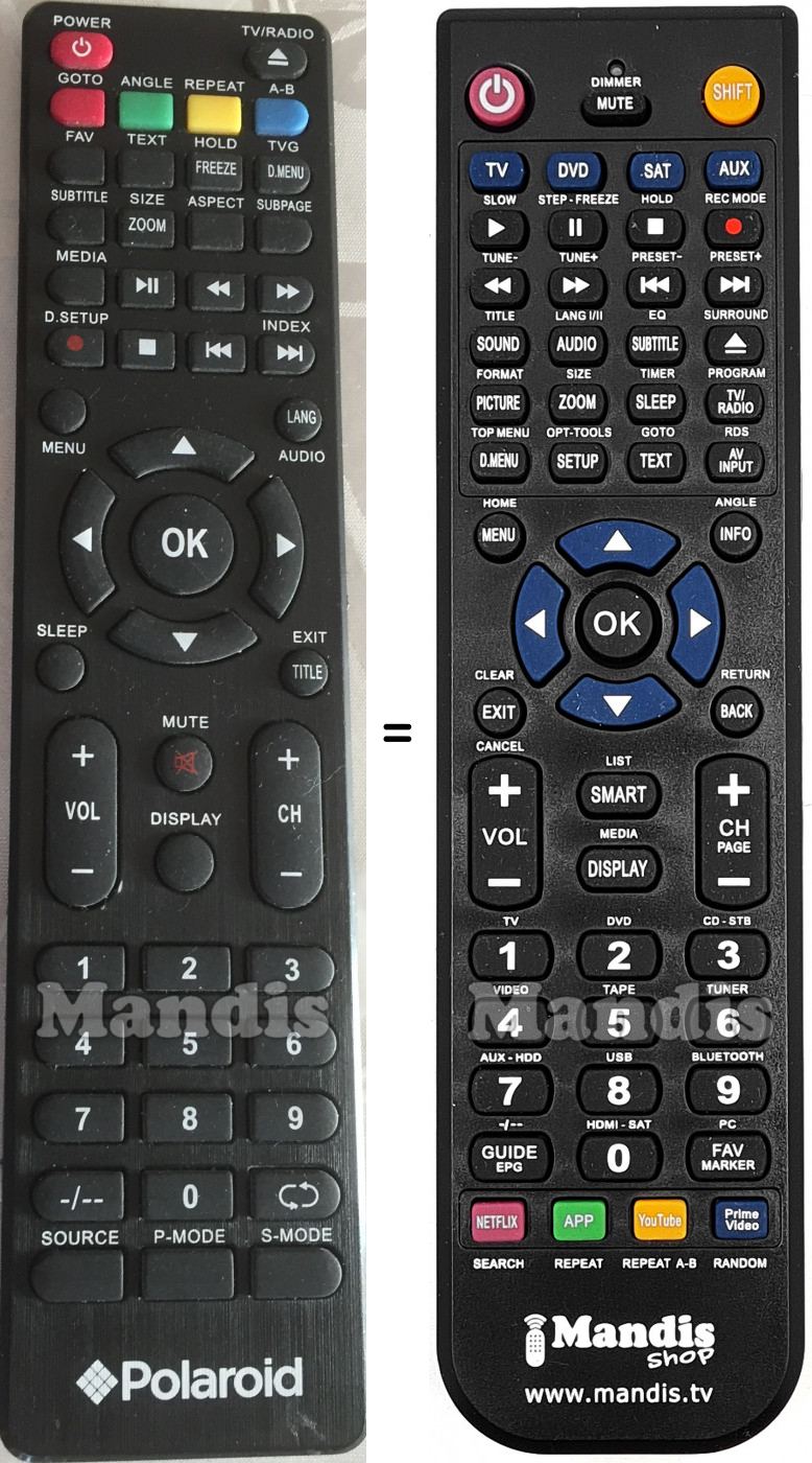 Below, we will show you the correspondence between each button on the original remote control and the button that performs the same function on the replacement remote control. In some cases, you may need to press the SHIFT key before pressing another button to perform certain actions. These additional functions are often not widely used and are included to facilitate understanding of the replacement remote control, or because the original remote control has more buttons than its equivalent.
