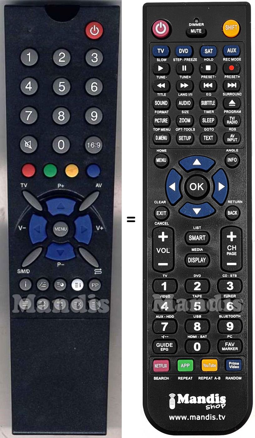 Below, we will show you the correspondence between each button on the original remote control and the button that performs the same function on the replacement remote control. In some cases, you may need to press the SHIFT key before pressing another button to perform certain actions. These additional functions are often not widely used and are included to facilitate understanding of the replacement remote control, or because the original remote control has more buttons than its equivalent.