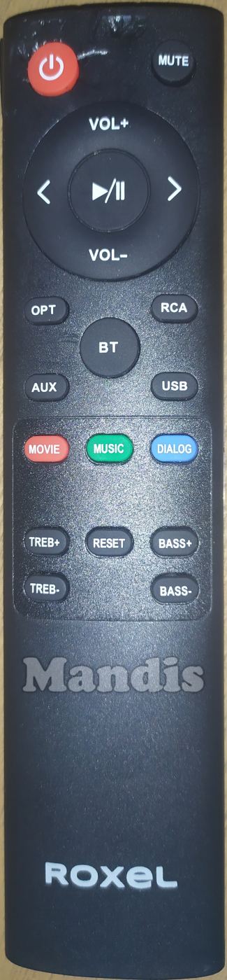 original remote control RSBS380 used for soundbar for the brand Roxel. This is an original remote control.