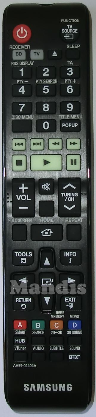 Power, Tv Source/Function, Open/Close, Sleep, 1/RDS Display, 2, 3/TA, 4/PTY-, 5/PTY Search, 6/PTY+, 7, 8, 9, Disc Menu, 0, Pop Up/Title Menu, I<<, >>I, <<, >>, Stop, Play, Pause, Vol+, Vol-, Tuning/CH+, Tuning/CH-, Mute, S/W Level, Full Screen, Home, Repeat, Tools, Info, Up, Down, Right, Left, Enter, Return, Exit, Red, Green, Yellow/Tuner Memory, Blue/MO/ST, Smart Hub, Search, 2D→3D, 3D Sound, vTuner, Audio, Subtitle, Effect/Sound