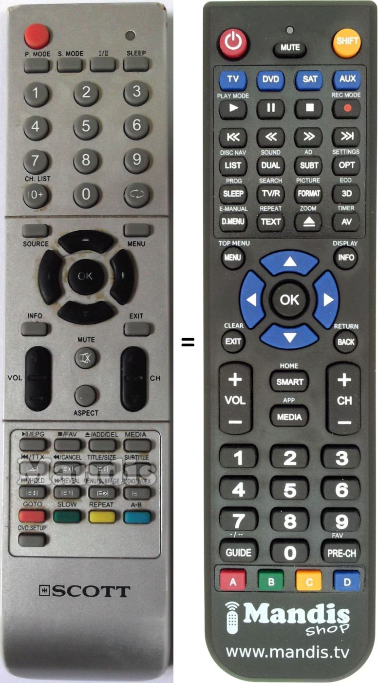 Below, we will show you the correspondence between each button on the original remote control and the button that performs the same function on the replacement remote control. In some cases, you may need to press the SHIFT key before pressing another button to perform certain actions. These additional functions are often not widely used and are included to facilitate understanding of the replacement remote control, or because the original remote control has more buttons than its equivalent.