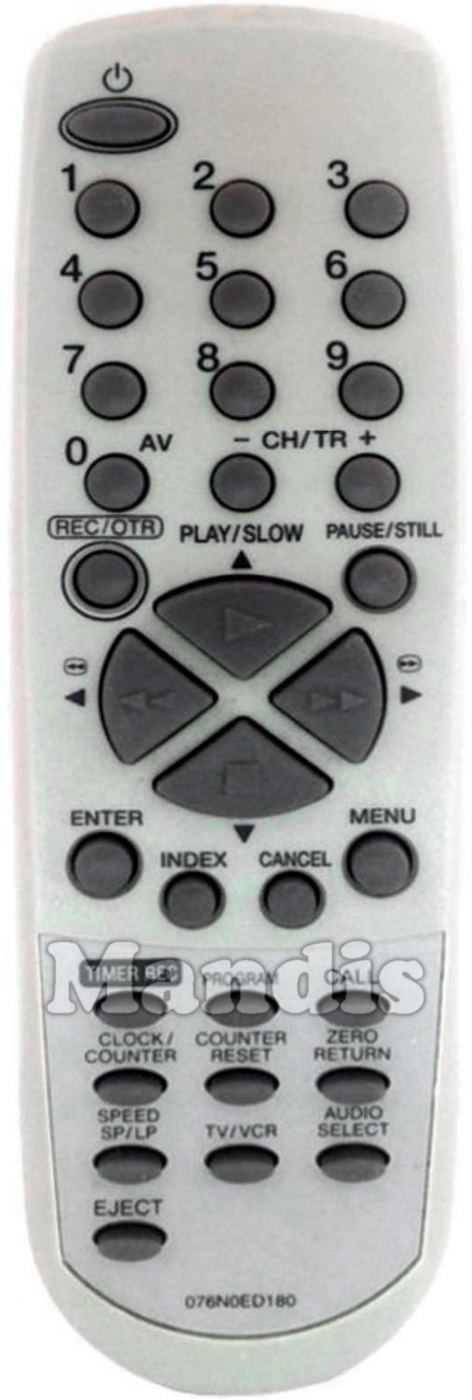 Power, 1, 2, 3, 4, 5, 6, 7, 8, 9, 0 / AV, CH/TR -, CH/TR +, REC / OTR, Pause / Still, Up / Play / Slow, Left / << / I<<, Right / >> / >>I, Down / Stop, Enter, Index, Cancel, Menu, Timer Rec, Program, Call, Clock / Counter, Counter Reset, Zero Return, Speed SP/LP, TV / VCR, Audio Select, Eject