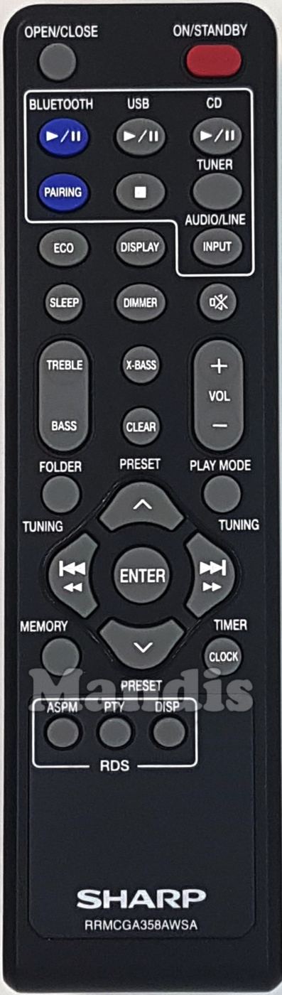 Original remote control RRMCGA358AWSA used for Music systems for the brand Sharp.