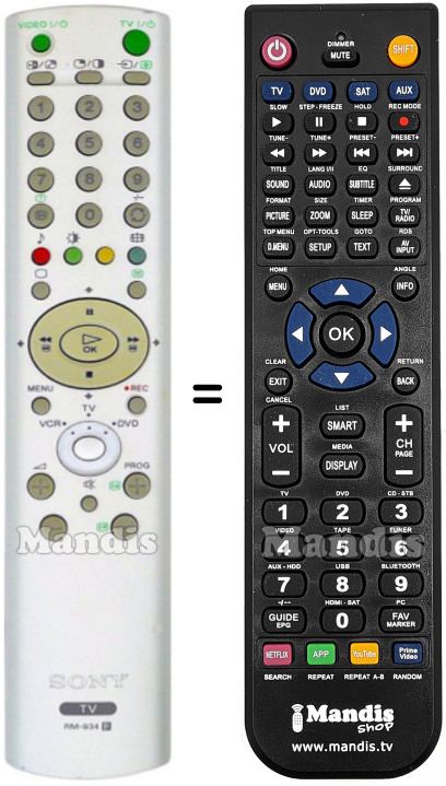 This remote control fully replaces your RM-934 (147670012) and offers all the functions of the original.