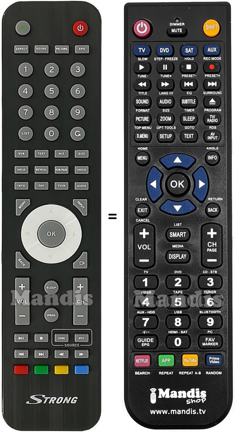 Below, we will show you the correspondence between each button on the original remote control and the button that performs the same function on the replacement remote control. In some cases, you may need to press the SHIFT key before pressing another button to perform certain actions. These additional functions are often not widely used and are included to facilitate understanding of the replacement remote control, or because the original remote control has more buttons than its equivalent.