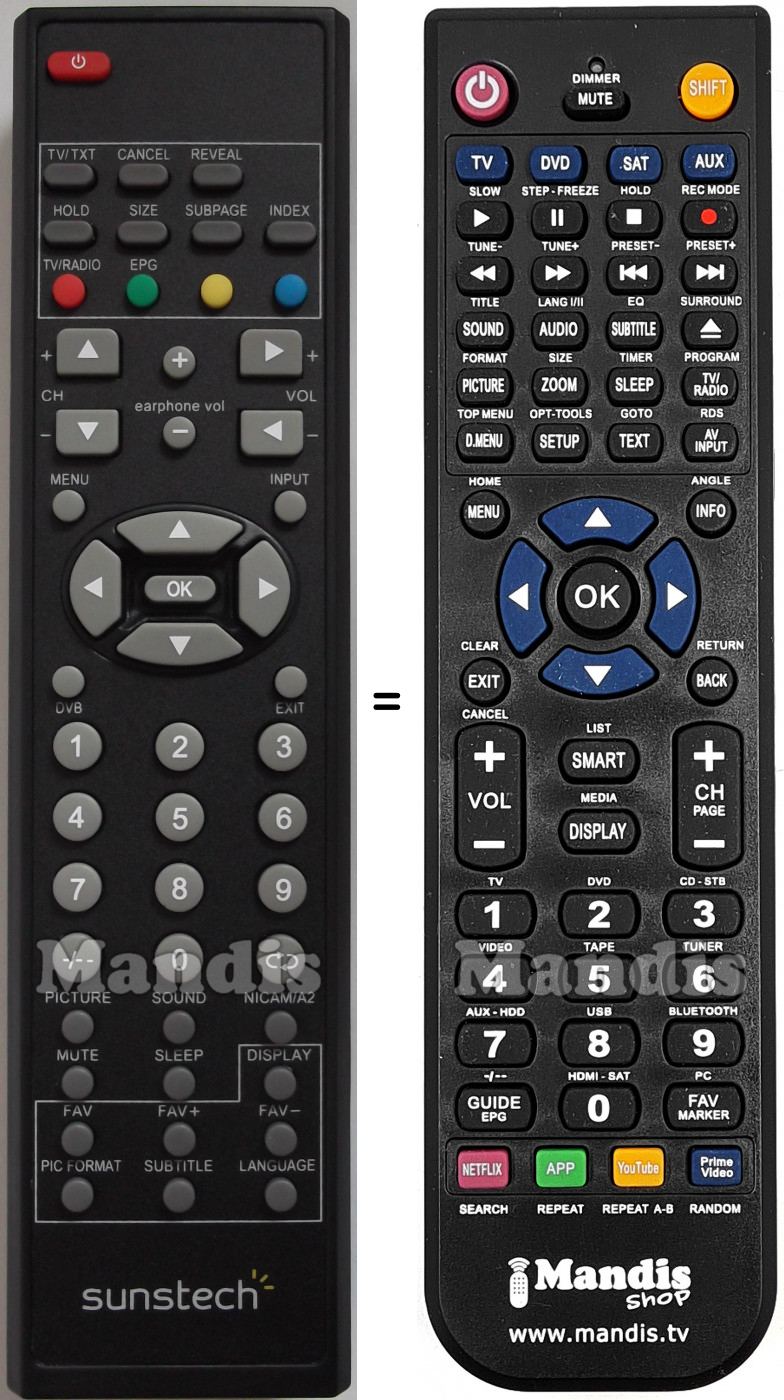Below, we will show you the correspondence between each button on the original remote control and the button that performs the same function on the replacement remote control. In some cases, you may need to press the SHIFT key before pressing another button to perform certain actions. These additional functions are often not widely used and are included to facilitate understanding of the replacement remote control, or because the original remote control has more buttons than its equivalent.