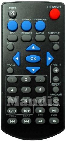 TFT On/Off, Mute, Setup, DVD/AV, DVD//ESB/CARD, OSD, Search, Audio, Subtitle, Menu, Title, Zoom, Up, Down, Right, Left, OK, 1, 2, 3, 4, 5, 6, 7, 8, 9, 0/10, 10+, Stop, I<<, >>I, <<, >>, Play/Pause, Program, Repeat, Vol+, Vol-
