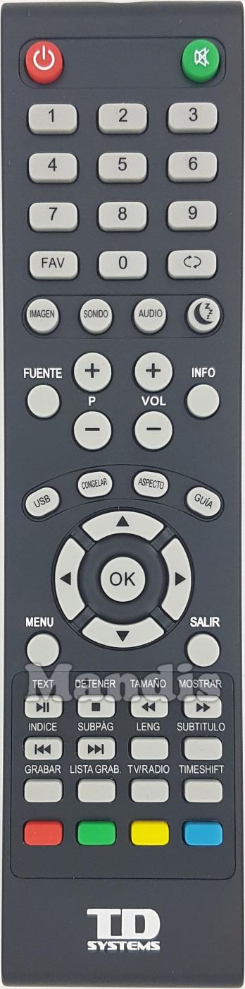 POWER, MUTE, 1, 2, 3, 4, 5, 6, 7, 8, 9, 0, FAV, RECALL, IMAGEN, SONIDO, AUDIO, SLEEP, FUENTE, INFO, P+, P-, VOL+, VOL-, USB, CONGELAR, ASPECTO, GUIA, OK, UP, DOWN, RIGHT, LEFT, MENU, SALIR, PLAY/PAUSE/TEXT, STOP/DETENER, <</TAMAÑO, >>/MOSTRAR, I<</INDICE, >>/SUBPAG, LENG, SUBTITULO, GRABAR, LISTA GRAB, TV/RADIO, TIMESHIFT, RED, GREEN, YELLOW, BLUE