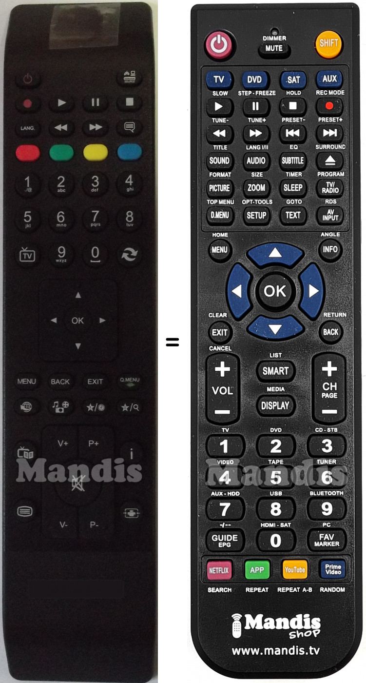 Below, we will show you the correspondence between each button on the original remote control and the button that performs the same function on the replacement remote control. In some cases, you may need to press the SHIFT key before pressing another button to perform certain actions. These additional functions are often not widely used and are included to facilitate understanding of the replacement remote control, or because the original remote control has more buttons than its equivalent.
