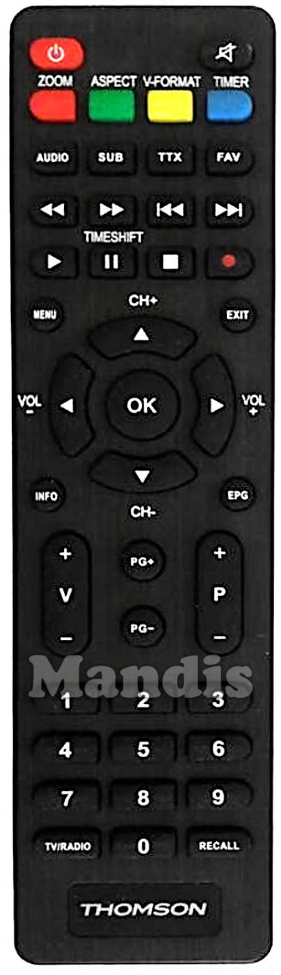 Power, Mute, Red / Zoom, Green / Aspect, Yellow / V-Format, Blue / Timer, Audio, Sub, TTX, Fav, <<, >>, I<<, >>I, Play, Pause / Timeshift, Stop, Rec, Menu, Exit, Info, EPG, Up / CH+, Down / CH-, Right / Vol+, Left / Vol-, OK, V+, V-, PG+, PG-, P+, P-, 1, 2, 3, 4, 5, 6, 7, 8, 9, 0, TV/Radio, Recall