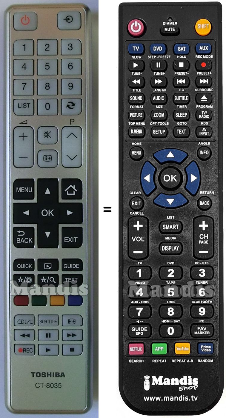 Below, we will show you the correspondence between each button on the original remote control and the button that performs the same function on the replacement remote control. In some cases, you may need to press the SHIFT key before pressing another button to perform certain actions. These additional functions are often not widely used and are included to facilitate understanding of the replacement remote control, or because the original remote control has more buttons than its equivalent.