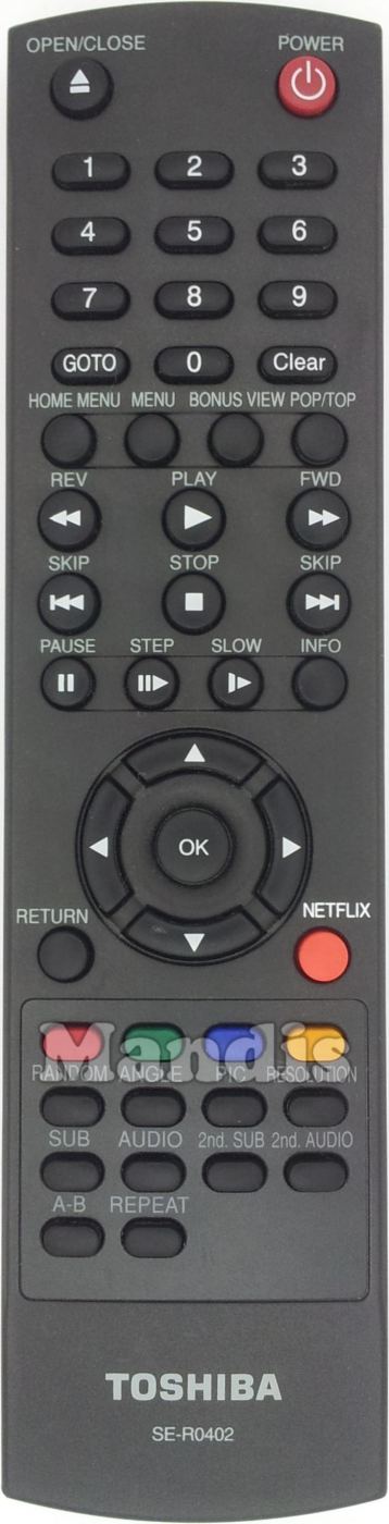Power, Open/Close, 1, 2, 3, 4, 5, 6, 7, 8, 9, 0, Goto, Clear, Home Menu, Menu, Bonus View, POP/TOP, <<, Play, >>, I<<, Stop, >>I, Pause, Step, Slow, Info, Return, Netflix, Up, Down, Right, Left, OK, Red, Green, Blue, Yellow, Random, Angle, PIC, Resolution, SUB, Audio, 2nd SUB, 2nd Audio, A-B, Repeat