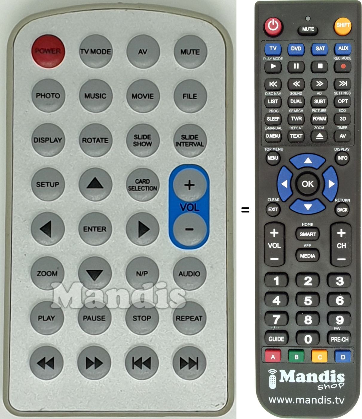 We offer a replacement remote control that completely replaces your original in all its functions. This isn't a universal remote, but an exact copy with all the same buttons and functionalities.