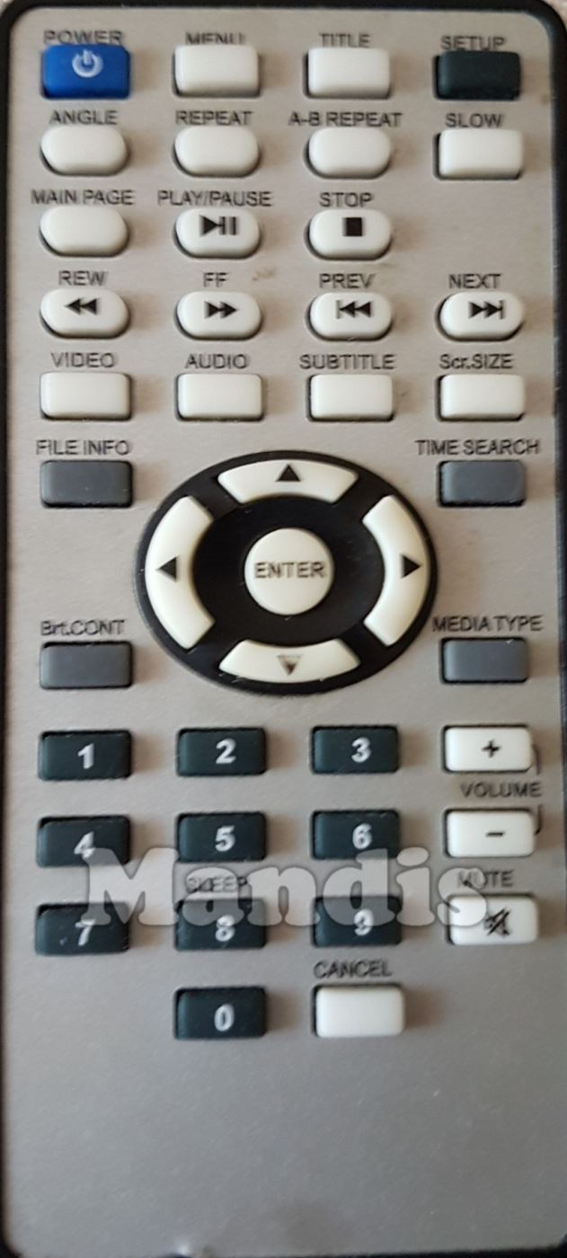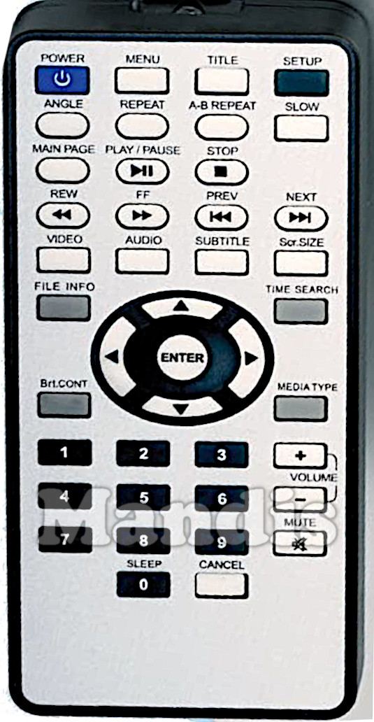 Power, Menu, Title, Setup, Angle, Repeat, A-B Repeat, Slow, Main Page, Play / Pause, Stop, << REW, >> FF, I<< Prev, >>I Next, Video, Audio, Subtitle, Scr. Size, File Info, Time Search, Brt. Cont, Media Type, Up, Left, Enter, Right, Down, 1, 2, 3, 4, 5, 6, 7, 8, 9, 0 / Sleep, Cancel, Volume+, Volume-, Mute