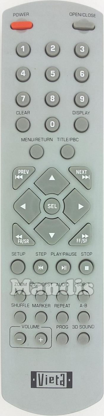 Power, Open/Close, 1, 2, 3, 4, 5, 6, 7, 8, 9, 0, Clear, Display, Menu/Return, Title/PBC, I<</Prev, >>I/Next, Up, Down, Right, Left, Sel, <</FR/SR, >>/FF/SF, Setup, Step, Play/Pause, Stop, Zoom, Audio, Sub-T, A-B, Repeat, Marker, Digest, Shuffle, 3D Sound, Prog, Volume+, Volume-